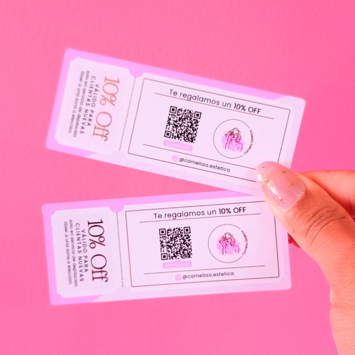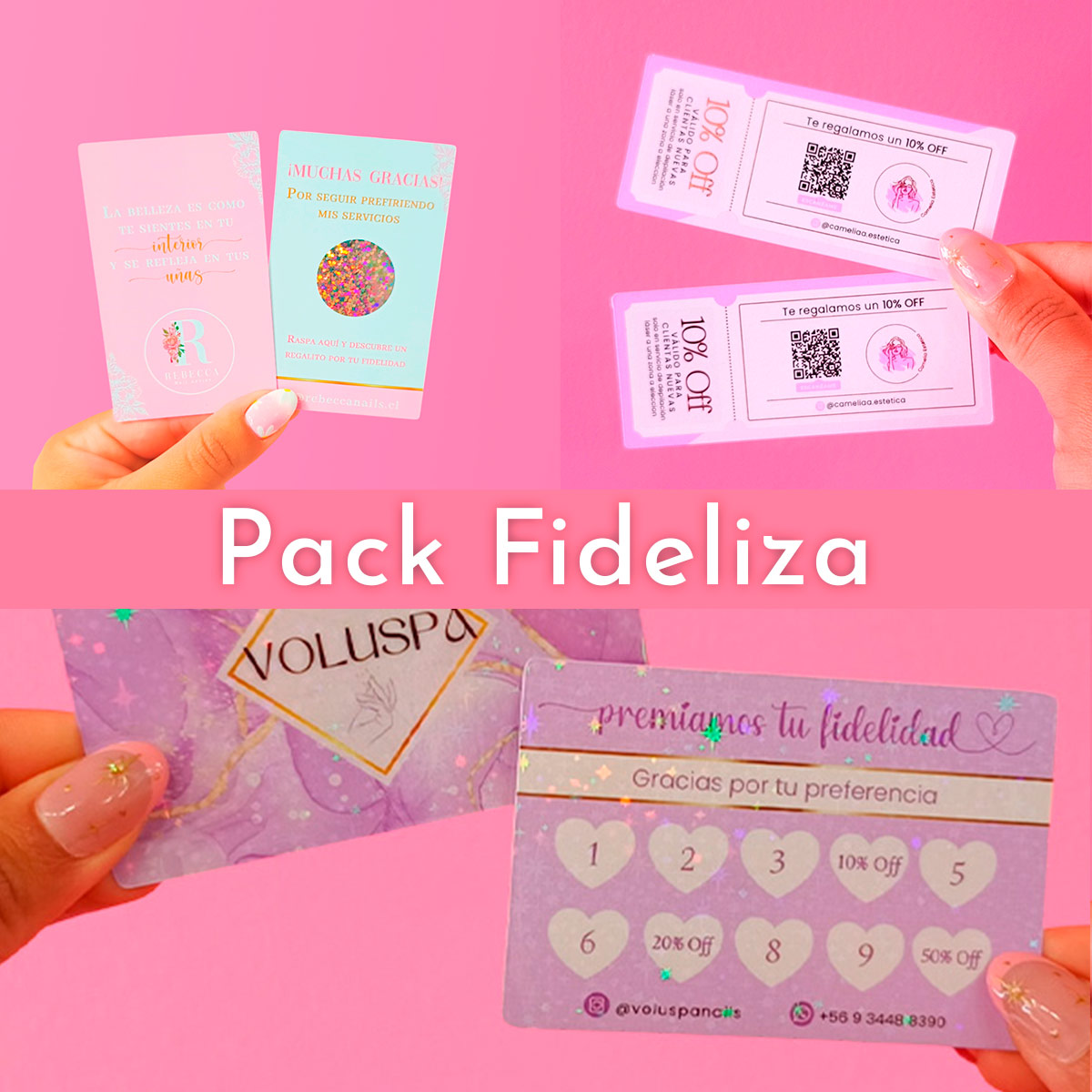 Pack Fideliza es un pack de papelería pensado para mujeres que buscan fortalecer la relación con sus clientas y potenciar la recompra. Además, incluye cupones de descuento, tarjetas de fidelidad y raspes, permitiendo incentivar nuevas visitas, premiar la lealtad y comunicar tu marca de manera clara y atractiva.
